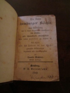 | 8670 | 4. | hamburger | die kleine hamburger köchin oder anweisung wie in einem bürgerlichen hausstande die küche, gut schmackhaft und abwechselnd und dabei wohlfeil zu führen ist. | louise richter | b.g. brendsohn, hamburg | 1845 | | 6,5 x 10,5 | 160 | 3183 | 5 | unbedruckter brauner lederrücken - mini ausgabe | | | |
