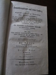| 8673 | 3.band r-z | haushalt | die hausfreundinn auf dem lande; oder möglichst vollständige anweisung für frauenzimmer, die ihren ländlichen haushalte mit ehren und votheil vorstehen, die geschäfte der küche, des kellers, und der vorraths=behältnisse selbst besorgen, und dabey zugleich ihre und der ihrigen gesundheit berücksichtigen wollen. | fr.(iedrich) röver | wilhelm heinrichshofen, magdeburg | 1823 | | 12,7 x 20,4 | 547 | 3228 | 4 | golddruck auf rücken | | | |