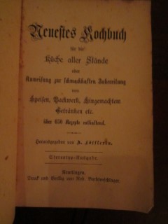 | 8677 | stereotyp ausgabe | deutsches | neuestes kochbuch für die küche aller stände od | charlotte löfflerin | rob. Bardtenschlager, reutlingen | 1900 | * | 9,3 x 13,8 | 224 | 2345 | 5 | buntes bild - leinenrücken | | | |