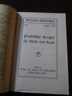 | 8685 | | deutsches | praktische rezepte für küche und haus | miniatur bibliothek nr. 142 | albert otto paul, leipzig | 1900 | * | 8 x 12 | 72 | ??? | 3 | schwarz roter druck, geheftet | | | |