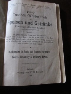 | 8695 | 1. u. einzige | lexikon | blühers taschen wörterbuch speisen und getränke franz./deutsch/englisch | | p. m. blüher, leipzig | 1898 | | 11,5 x 17,7 | 144 | 423 | 4 | taschenbuch,golddruck auf grün | | | |