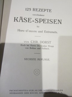 | 8698 | 6. | käse | 125 rezepte verschiedener käse speisen für hors d'oeuvre und entrements | chr. Dorst | fachschriftenverlag des int. Verbandes der köche, frankfurt | 1910 | * | 11,6 x 16,6 | 39 | 809 | 3 | schwarzer druck auf hellem leinen | | | |