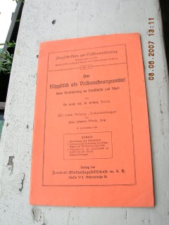 | 878 | | fisch | fischkochbuch - rezepte zur bereitung von fischspe | | städtischer fischausrufmarkt karlsruhe ernst stiess, karlsruhe | 1915 | * | 12 x 18 | 46 | | 6 | geheftet | | | |