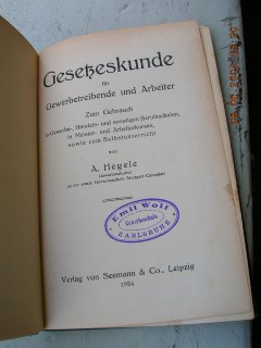 | 876 | | gesetz | gesetzeskunde für gewerbtreibende und arbeiter | a. hegele | seemann &co. Leipzig | 1924 | | 13 x 19 | 128 | | 4 | weißer druck auf grünem karton | | | |