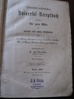 | 8798 | | chemie | chemisch technisches universal receptbuch enthaltend das ganze wissen der warmen und kalten destillation sowie | c. hofmann, professor der chemie | friedrich stahn, berlin | 1880 | | 15,5 x 21,3 | 560 | | 5 | golddruck auf leinenrücken | | | |