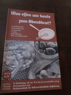 | 8804 | | deutsches | was essen wir heute zum abendbrot? | reichsausschuß für volkswirtschftliche aufklärung | beyer verlag leipzig | 1943 | * | 17 x 26,5 | 32 | | 4 | geheftet | | | |