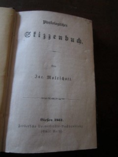 | 8815 | 1. | nahrungsmittel | physiologisches skizzenbuch | dr. jac. Moleschott | ferber'sche universitäts buchhandlung, gießen | 1861 | | 12,5 x 17,8 | 320 | | 4 | golddruck am leinenrücken | | | |
