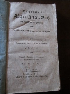 | 8818 | 4. | küchenzettel | tägliches küchen = zettel = buch mit rücksicht auf die jahreszeit, oder: was können, sollen und wollen wir essen? | august erdmann lehmann | p.g. hilscher, dresden | 1827 | | 12,7 x 21,5 | 98 | 2255 | 5 | unbedruckter umschlag der zeit | | | |
