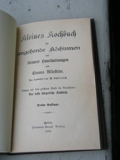 | 81 | 3. | deutsches | kleines kochbuch für angehende köchinnen | emma allestein | hermann kanitz' verlag | 1898 | | 12 x 18,5 | 216 | 75 | 3 | schwarzer druck-braunes leinen | | | |