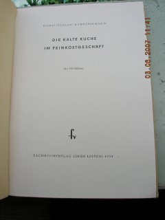 | 90 | 1. | kalte küche | die kalte küche im feinkostgschäft | horst fiedler - kurt sparmann | fachbuchverlag gmbh, leipzig | 1953 | | 15,3 x 21,2 | 208 | | 4 | blau roter druck auf karton-leinenrücken | | | |