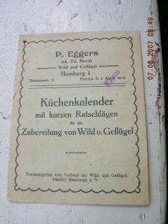 | 893 | | kalender | küchenkalender mit kurzen ratschlägen | p. eggers | verband der wild- u. geflügelhändler | 1927 | | 12,2 x 16 | 4 | | 3 | geheftet | | | |