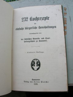 | 900 | 7. | hannover | 232 kochrezepte für einfache bürgerliche haushaltu | städtische gewerbe- und haushaltungsschule zu hann | verlag von heinr. Feesche,hannover | 1926 | | 12,5 x 19,3 | 80 | | 4 | schwarzer druck auf grünem karton | | | |
