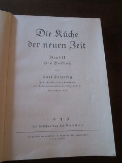 | 9027 | 1. | berliner | die küche der neuen zeit - das backbuch - band 2 | luzi letzring, fachlehrerin an der kochschule des berliner hausfrauen vereins | im selbstverlag der verfasserin | 1935 | | 15 x 21,4 | 107 | | 4 | brauner druck auf papp + leinenrücken | | | |