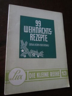 | 9434 | die kleine reihe 13 | weihnacht | 99 weihnachtsrezepte | erna horn buchenau | sebastian lux, murnau/münchen | 1940 | * | 12,5 x 17 | 30 | | 2 | geheftet, grüner druck | | | |
