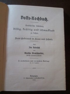 | 9439 | 2. verb.u.verm. | deutsches | volks - kochbuch | ida rudolph und martha riemschneider | l.scheermessers hofbuchhandlung, salzungen | 1910 | | 14 x 19 | 120 | 3276 | 4 | weißer druck - blauer leinenrücken | | | |