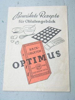 | 950 | | optimus | bewährte rezepte für oblatengebäck | | optimus der fa. Franz hoch, miltenberg a. m. | 1915 | * | 10,7 x 15 | 7 | | 4 | gefaltet 3 falz | | | |