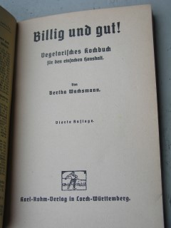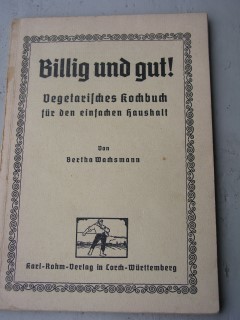 | 952 | 4. | vegetarisch | billig und gut - vegetarisches kochbuch für den ei | bertha wachsmann | karl rohm verlag in lorch- würtemberg | 1930 | * | 12,8 x 18,6 | 63 | | 5 | paperback - schwarzer druck | | | |
