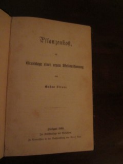 | 9617 | 1. | vegetarische | pflanzenkost, die grundlage einer neuen weltanschauung | gustav struve | selbstverlag, stuttgart | 1869 | | 13 x 20 | 135 | | 4 | golddruck auf halblederrücken | | | |