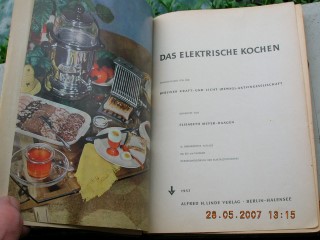 | 1006 | | elektrisch | das elektrische kochen | elisabeth meyer haagen | beriner kraft- und licht ag., berlin | 1957 | | 17 x 24 | 310 | | 5 | schwarzer druck auf blauem karton - schutzfolie | | | |