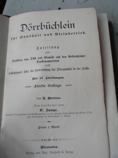 | 1058 | 5. | dörren | dörrbüchlein für haushalt und kleinbetrieb | e. junge - r, mertens | verlag von rud. Bechtold & komp. | 1902 | | 13 x 18,3 | 121 | 2533 | 4 | goldprägedruck am rücken auf rot | | | |