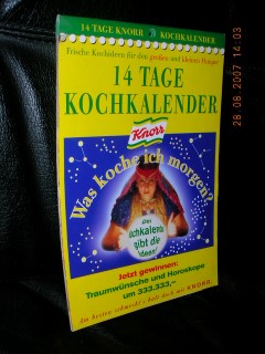 | 1375 | | knorr | 14 tage kochkalender - was koche ich morgen? | rezeptservice | c. h. knorr | 1997 | * | 11,8 x 17 | 28 | | 2 | geheftet - vorgelocht | | | |